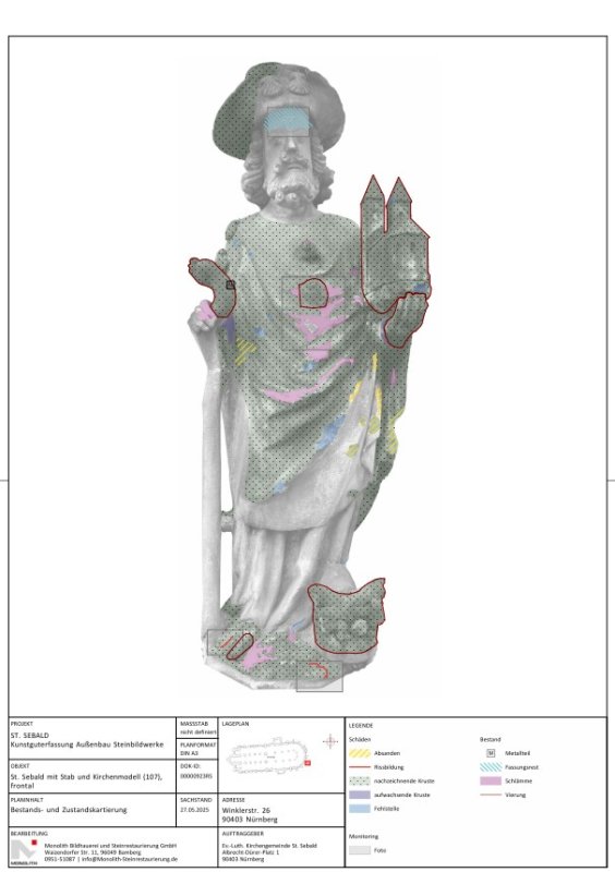 Seit 2023 ist die Firma in mehreren Teilprojekten damit beauftragt, die Konsolen, Skulpturen, einige Reliefs sowie Inschriften entlang der Fassade des Kirchengebäudes systematisch zu erfassen. Dies beinhaltet u. a. die Befahrung der einzelnen Objekte mit Hilfe einer Arbeitsbühne, um Be- und Zustand aus der Nähe kartieren zu können. Zudem sind von einigen der Schäden auch hochauflösende Fotografien erstellt worden, um diese mittels erarbeitetem Monitoringprogramm archivieren und in den folgenden Jahren beobachten zu können.